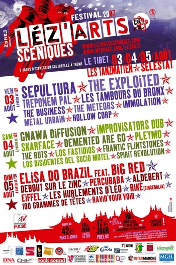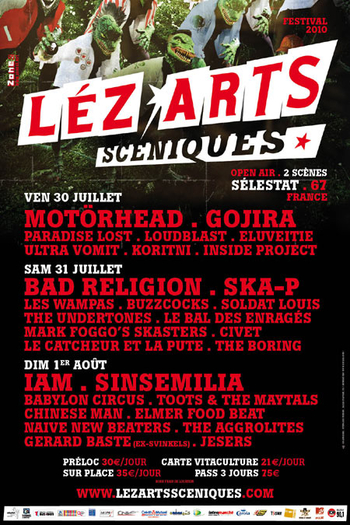 MOTÖRHEAD, SEPULTURA, SHAKA PONK, JIMMY CLIFF, GOJIRA, SUM41, IAM, RANCID, SEPULTURA, THE DUBLINERS, EZ3KIEL, SUICIDAL TENDENCIES, TRYO, PUBLIC ENEMY, GRAND CORPS MALADE, SICK OF IT ALL, TAGADA JONES, PARABELLUM, BURNING HEADS, NOSTROMO, 25TALIFE, HIGHTONE, NAPALM DEATH, HATEBREED, BLACKFIRE, LEE SCRATCH PERRY, AGNOSTIC FRONT, THE BUSINESS, THE EXPLOITED, TREPONEM PAL, IMMOLATION, METAL URBAIN, ENTOMBED, MASS HYSTERIA, APOCALYPTICA, REVEREND HORTON HEAT, PARADISE LOST, ULTRA VOMIT, CIVET, THE UNDERTONES, BAD RELIGION, SKA-P, BUZZCOCKS, THE AGGROLITES, HELLOWEEN, ARCH ENNEMY, EPICA, MADBALL, SPIRITUAL BEGGARS, GRAND MAGUS, PENNYWISE, NEUROSIS, AKHENATON & FAFA LARAGE, TOKYO SKA PARADISE ORCHESTRA, MINISTRY, KREATOR, SODOM, DESTRUCTION, NEW MODEL ARMY, MUNICIPAL WASTE, CATHERINE RINGER, THE BLOODY BEETROOTS, THE TOY DOLLS, BIRDY NAM NAM …
